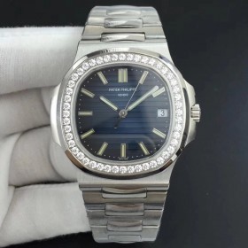 PF공장 V2 파텍필립 노틸러스 점보 5711 스틸 블루다이얼 다이아몬드베젤 브레이슬릿 Nautilus Jumbo 5711 Blue Textured Dial Diamonds Bezel on SS Bracelet A324 Clone > 파텍필립뒤로