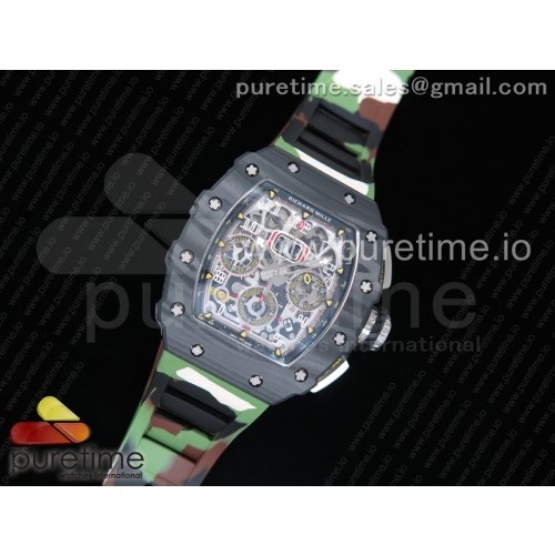 • KU공장 리차드밀 RM011 카본케이스 크로노 크리스탈스켈레톤 옐로우다이얼 카모플라쥬러버스트랩 RM011 Carbon Case Chrono Crystal Skeleton Yellow Dial on Camouflage Rubber Strap A7750 KV공장