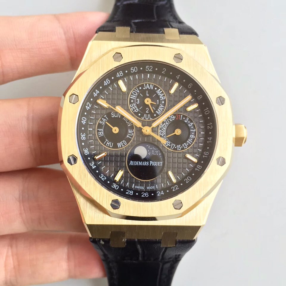 BF공장 오데마피게 로얄오크 퍼페츄얼 캘린더 옐로우골드 여러다이얼 블랙가죽스트랩