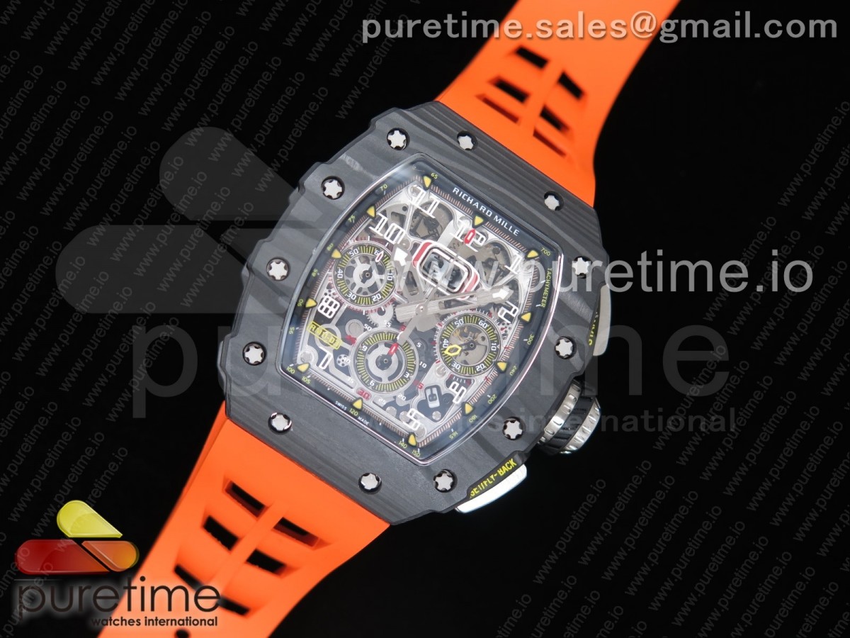 KU공장 리차드밀 RM011 카본케이스 크로노 크리스탈스켈레톤 옐로우다이얼 오렌지레이싱러버스트랩RM011 Carbon Case Chrono Crystal Skeleton Yellow Dial on Orange Racing Rubber Strap A7750 KV공장
