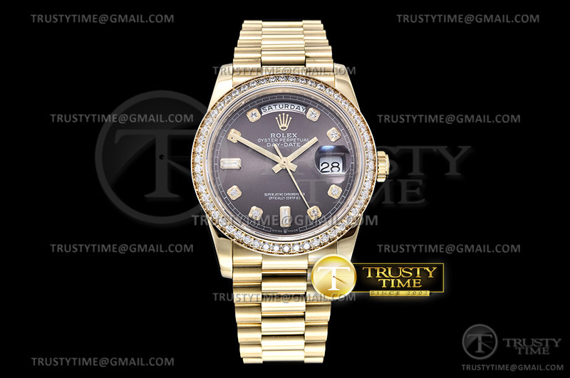 GM공장  롤렉스 데이데이트 36 옐로우골드 금통 다이아몬드인덱스 그레이다이얼 2836 DayDate 36mm Flt Pres 904L Dia YG/YG Gry/Dia GMF A2836